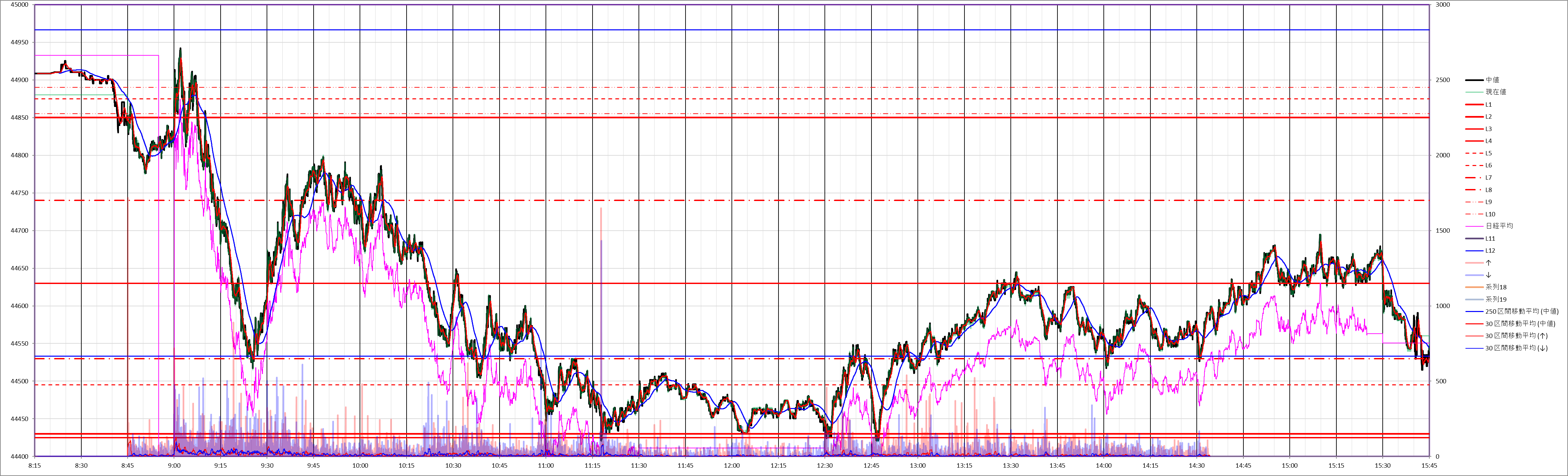 今日の225先物miniは、前場は荒れた下降トレンド、後場はレンジ相場になりました。
