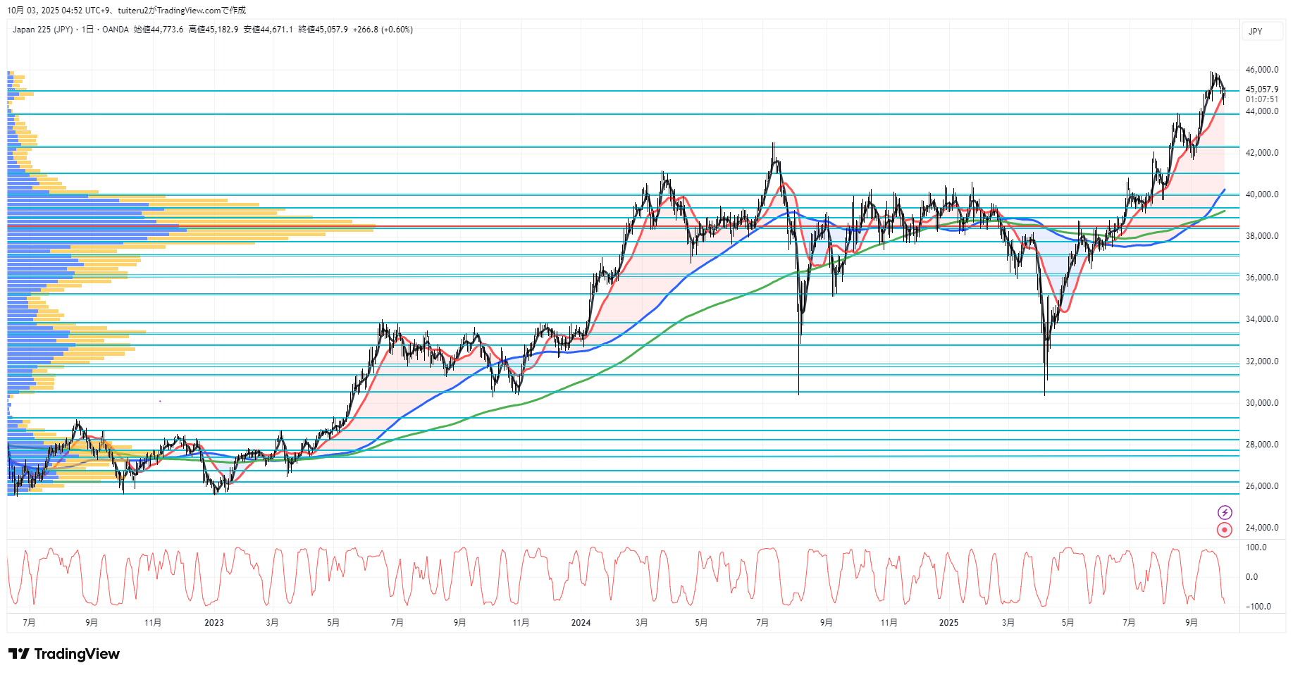 価格帯別出来高の山頂付近で、各MAが収斂中です。ちょっと様子見です。