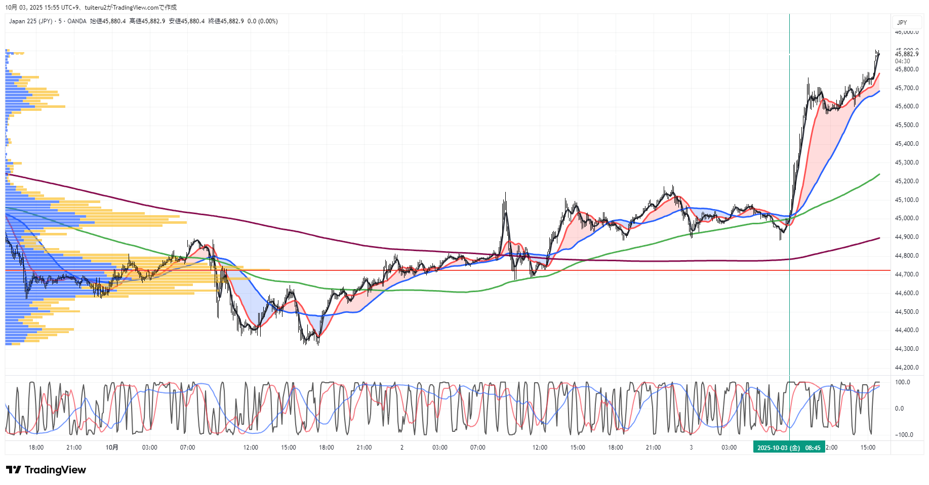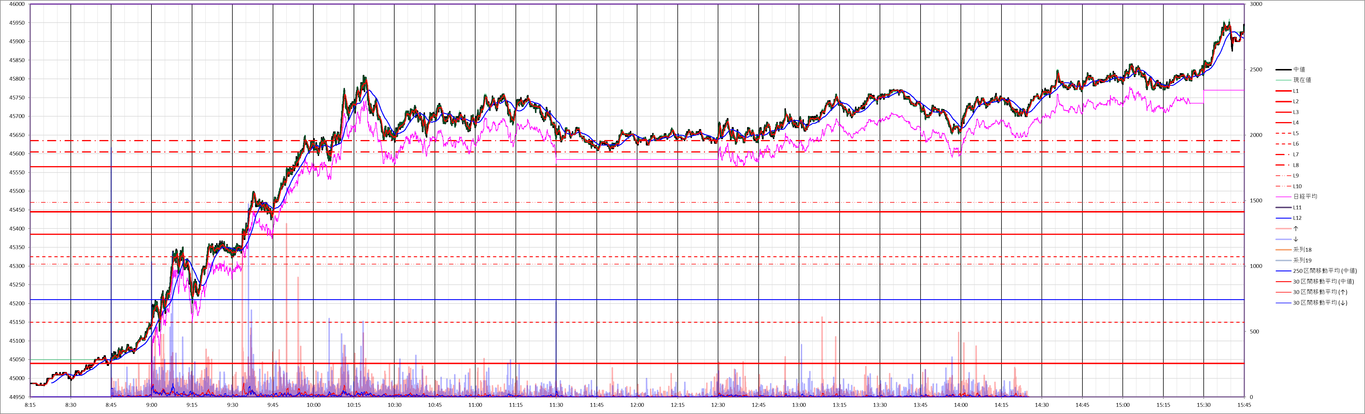 今日の225先物miniは、何があったか判りませんが、爆上げの上昇トレンドデイになりました。