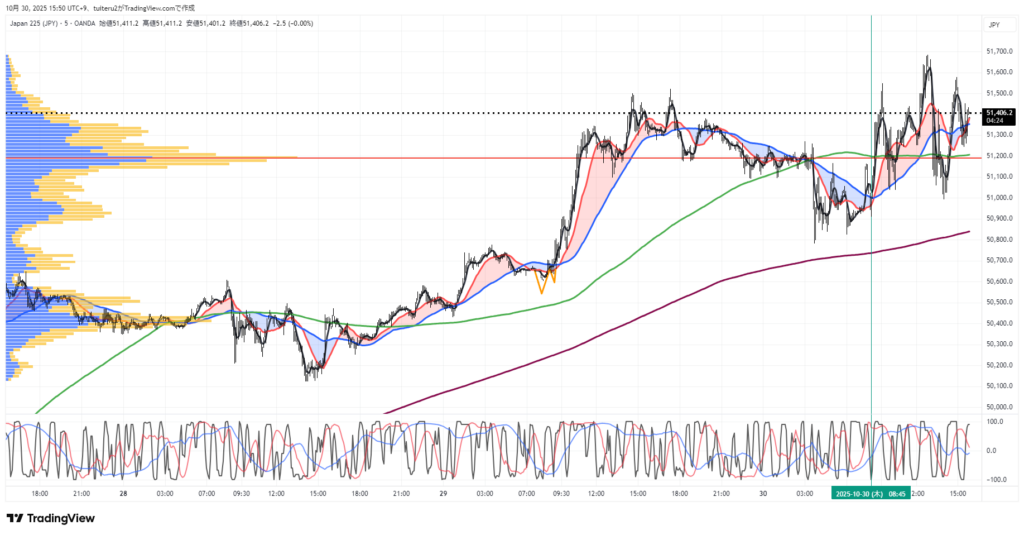 上昇パーフェクトオーダー継続中ですが、現在値が5MA(黒) の下に入りました。
