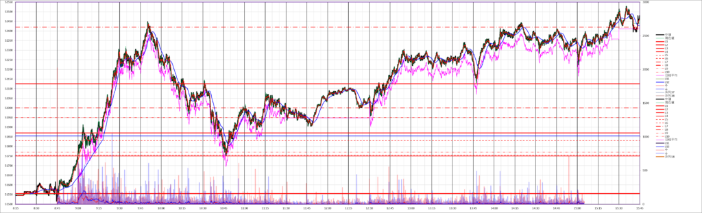 今日の225先物miniは、前場は大きく上下しましたが、その後は上昇トレンドになりました。