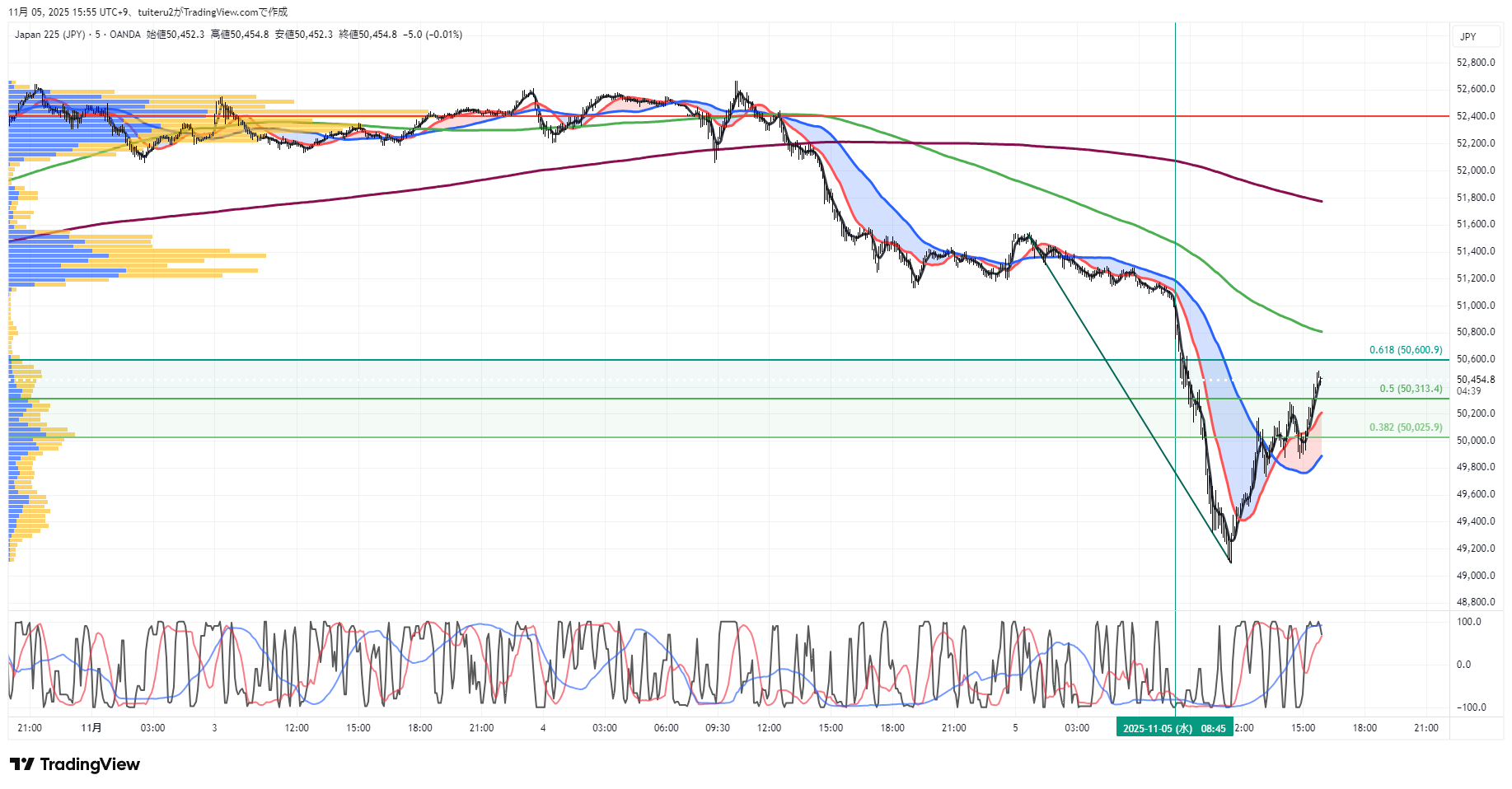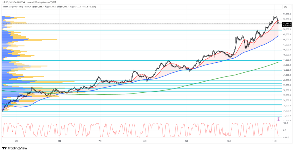 上昇パーフェクトオーダー継続中ですが、現在値は5MA    (黒)の下に入りました。