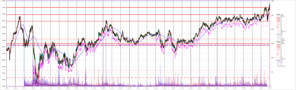 今日の225先物miniは、前場は大荒れのレンジ相場、後場は上昇トレンドになりました。