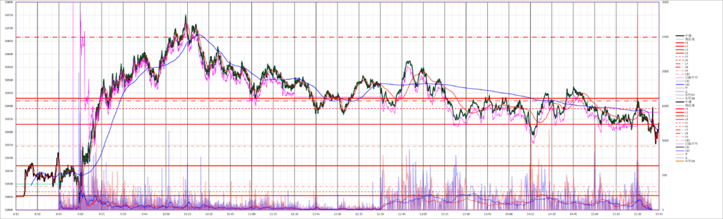 今日の225先物miniは、9時に底を付けて10時過ぎまで急上昇、後は緩やかな下降トレンドになりました。