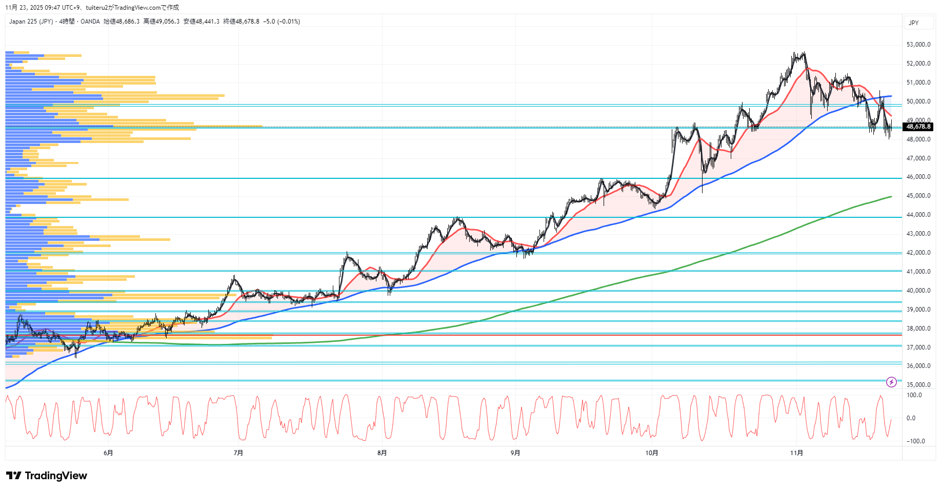価格帯別出来高の山頂付近でレンジ帯にいます。