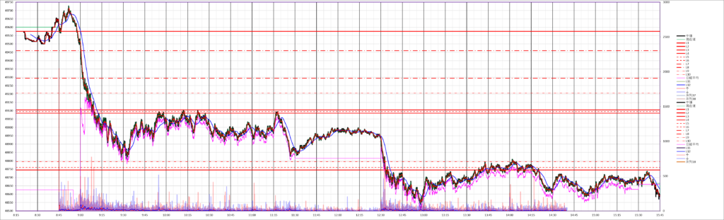 今日の225先物miniは、9時前が最高値で、その後は『急落とレンジ』を繰り返す展開の下降トレンドになりました。