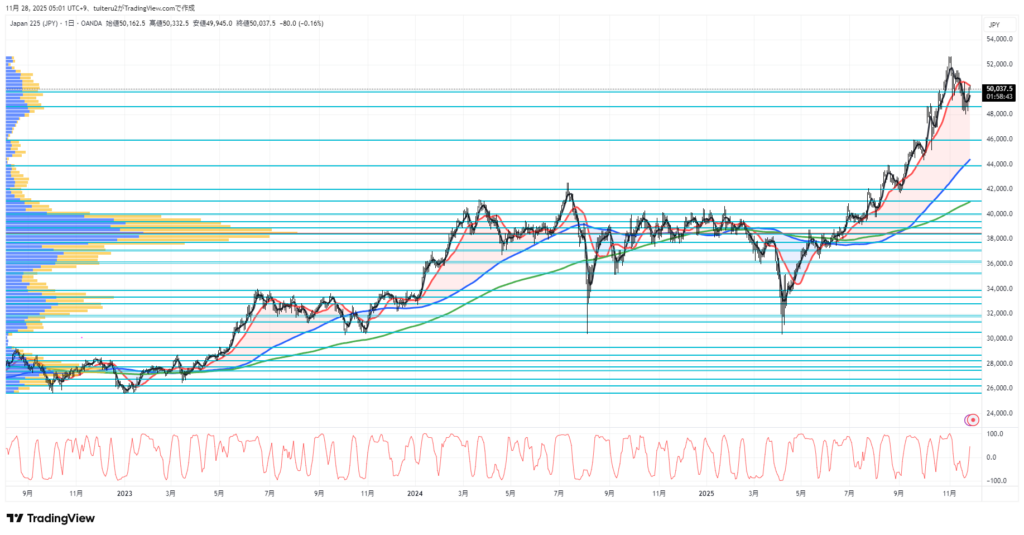 価格帯別出来高のピークに挟まれたレンジ帯の上限にいます。