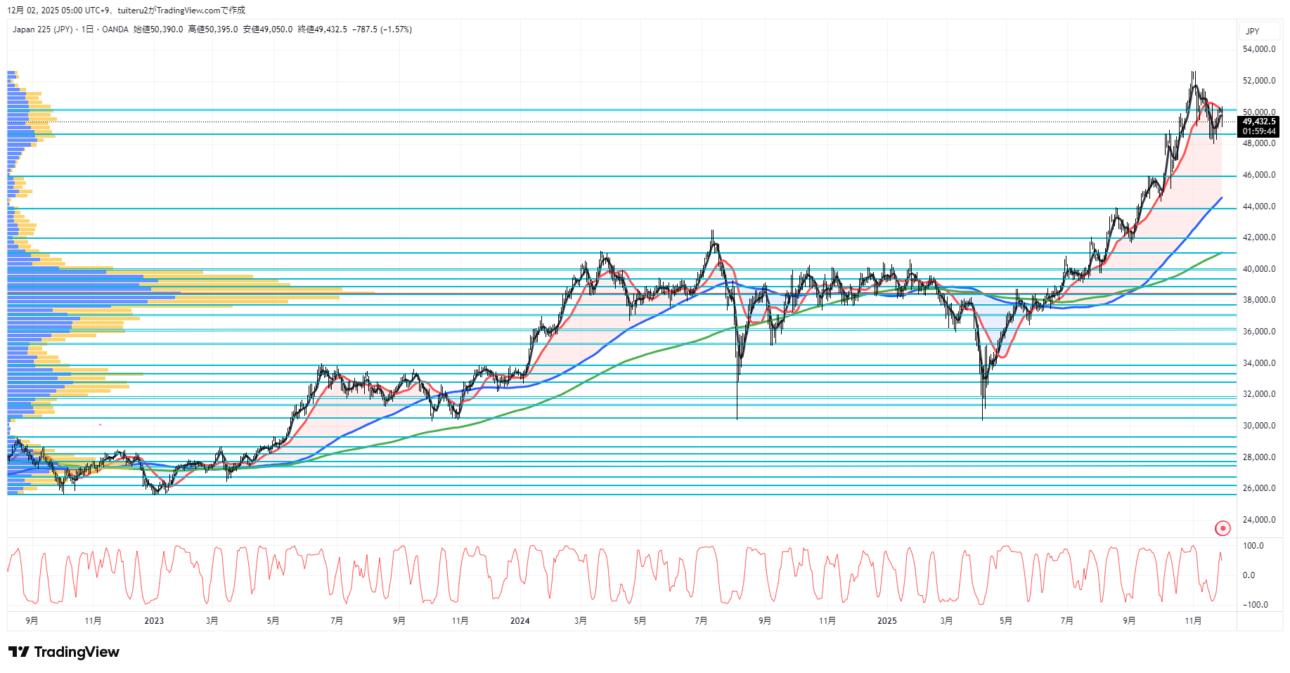 価格帯別出来高のピークに挟まれたレンジ帯の上限にいます。