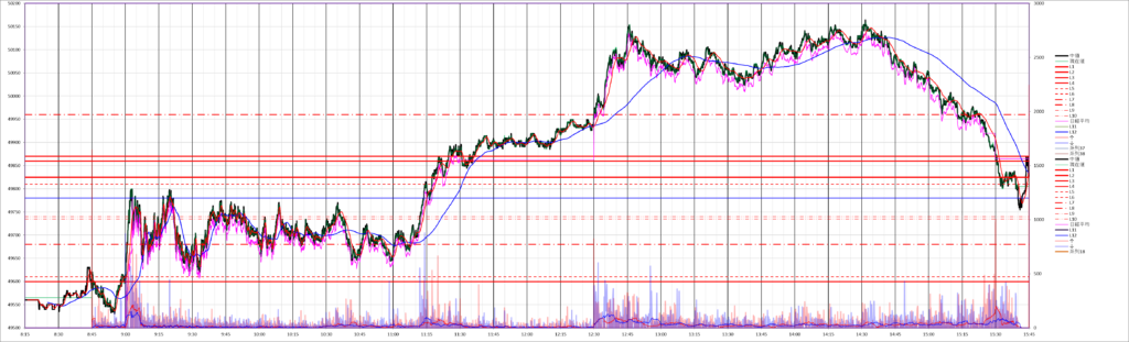 今日の225先物miniは、前場は狭い値幅の広いレンジ、後場は14時30分まで急上昇、それ以降は急下落の荒れた相場となりました。